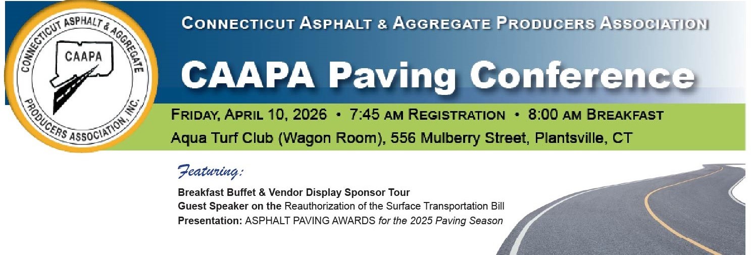 The Connecticut Asphalt & Aggregate Producers Association (CAAPA) invites you to attend the CAAPA Paving Conference on Friday, April 10, 2026, at the Aqua Turf Club, beginning at 7:45 AM. Join industry colleagues for a morning of networking, industry insights, and recognition of excellence in asphalt paving.